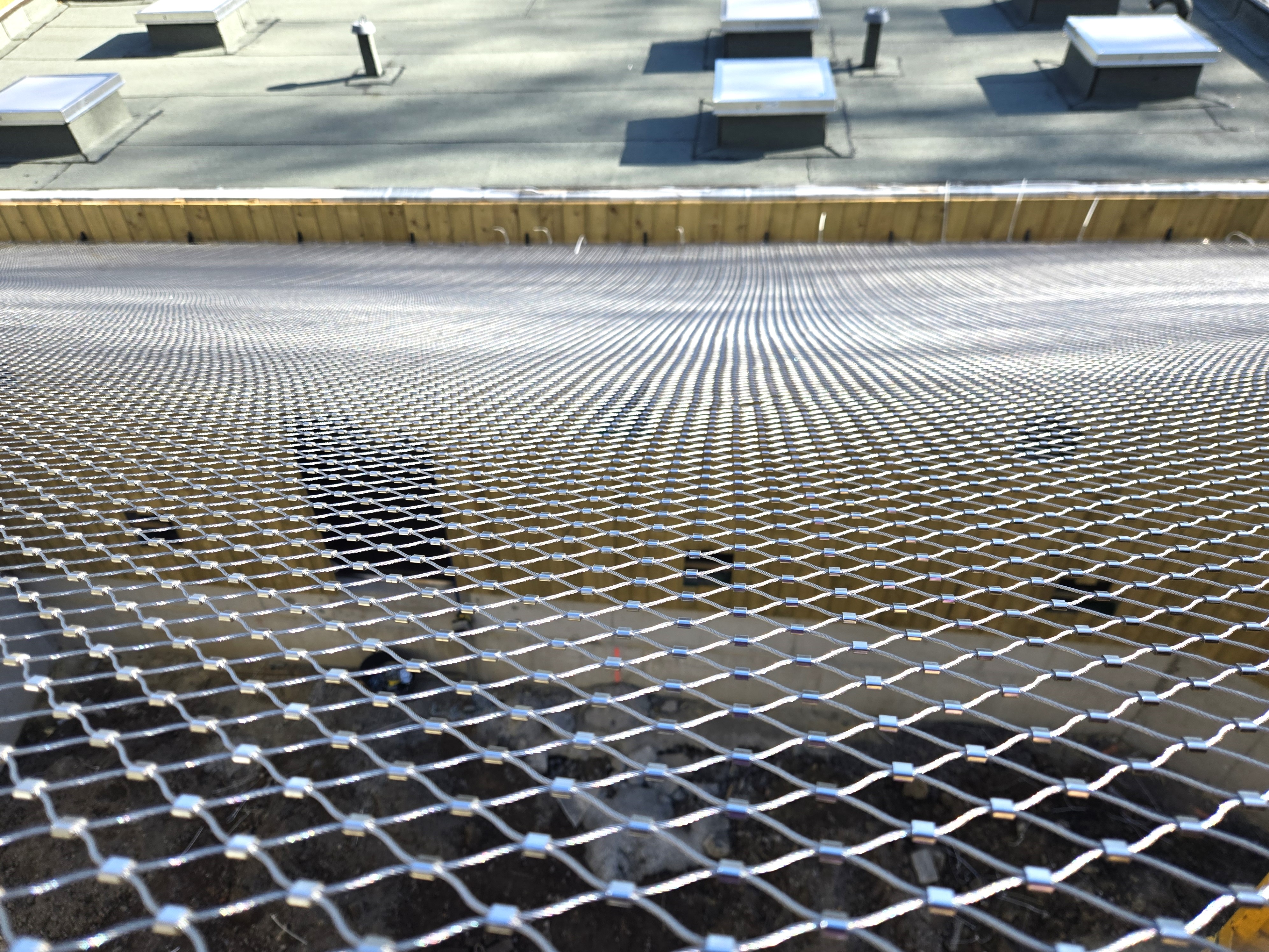 La phase de pose a été confiée à notre partenaire installateur certifié Profil Rope, spécialiste reconnu de la mise en œuvre de systèmes câblés et de filets inox sur des chantiers d'envergure.