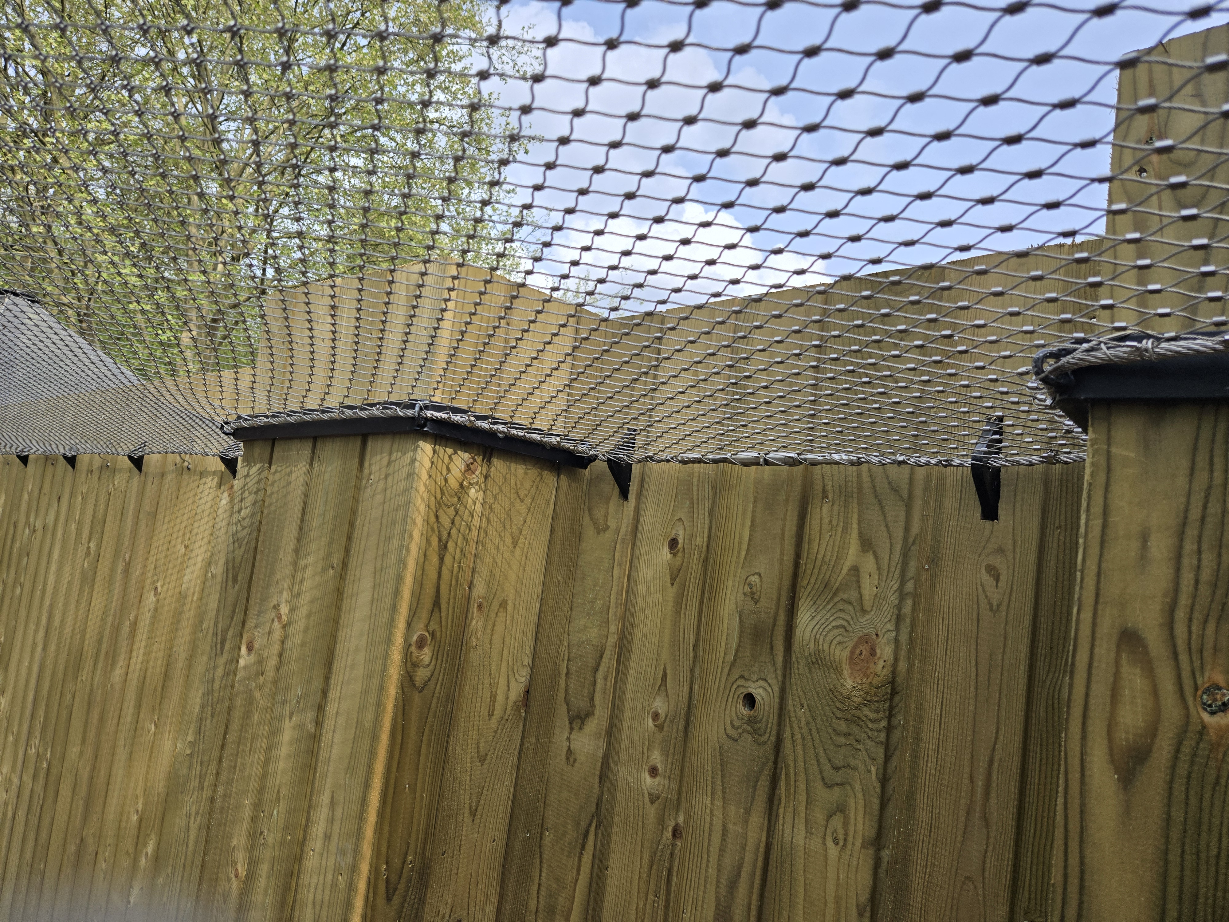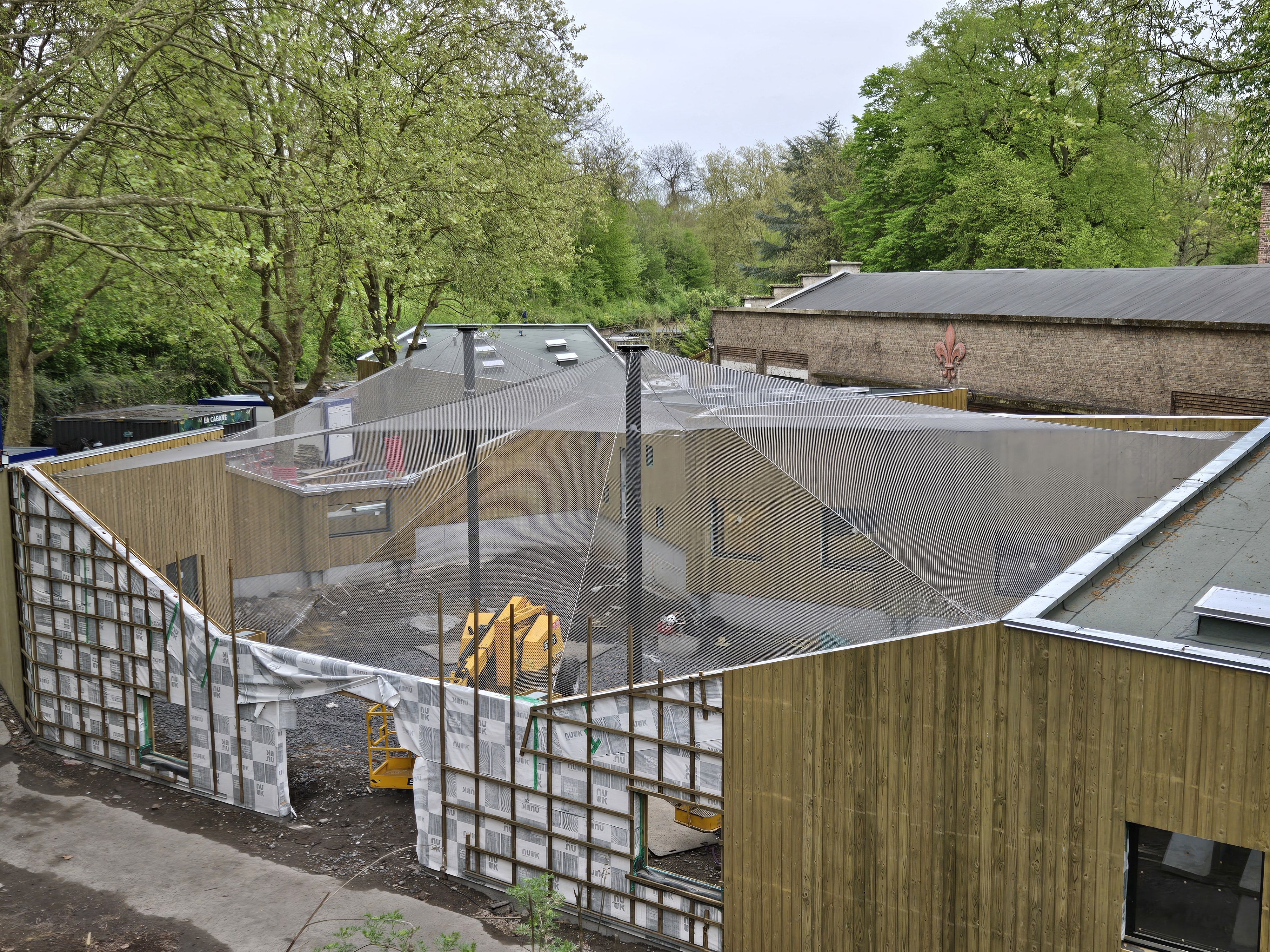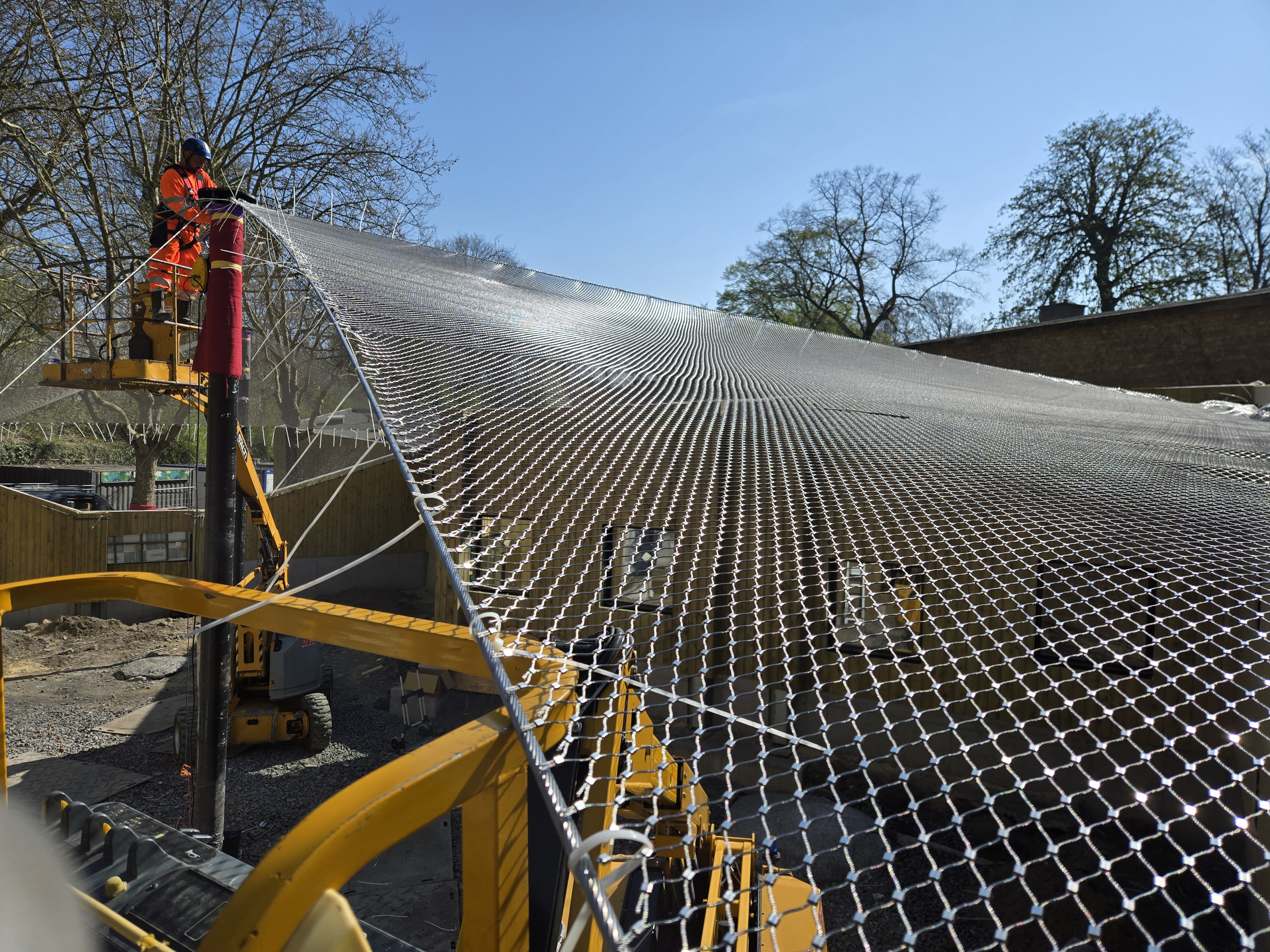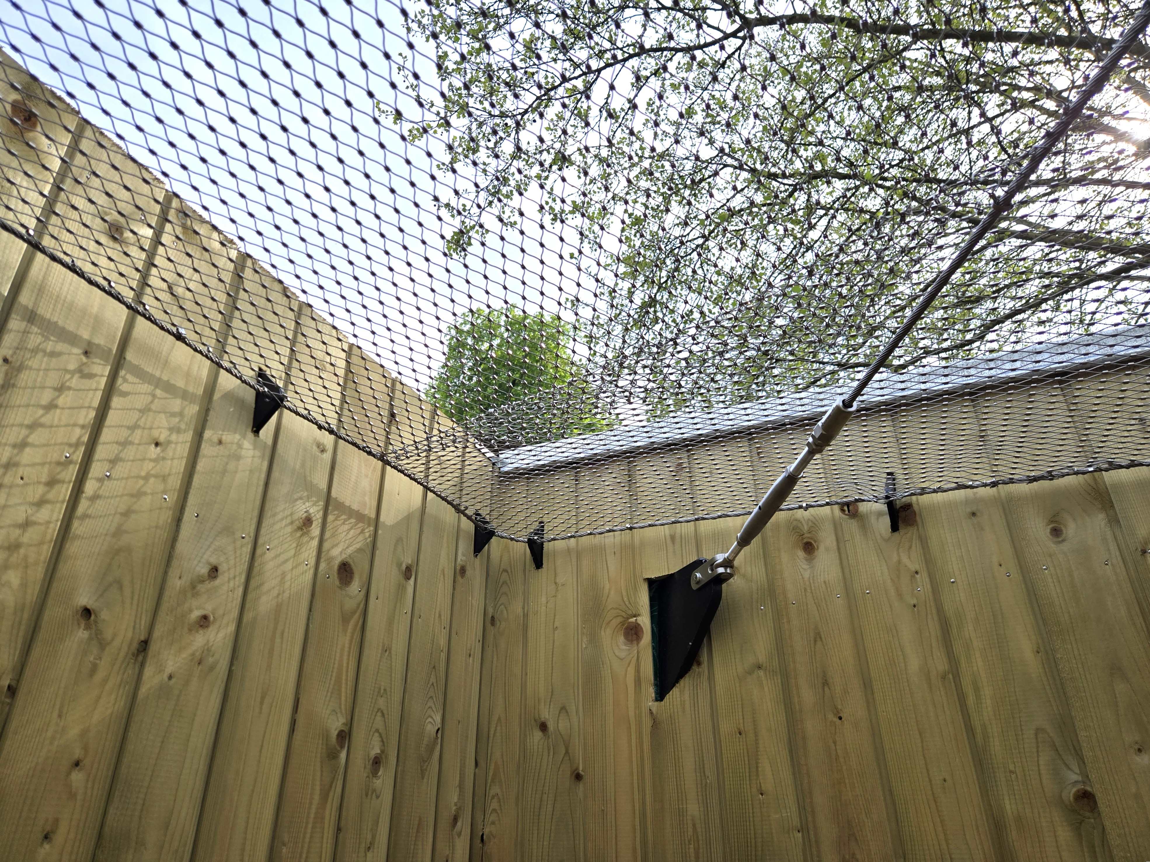 Sur ce projet, l'enclos existant avec ses murs béton et son bardage bois constituait la structure périphérique de base. Le filet y est ancré en périphérie via des câbles inox repris sur la structure de l'enclos, formant un cadre de tension continu sur tout le pourtour de la volière. Cette intégration à la structure existante est un point fort du filet inox : il s'adapte à n'importe quelle géométrie, irrégulière ou non, sans imposer la construction d'un cadre tubulaire supplémentaire.