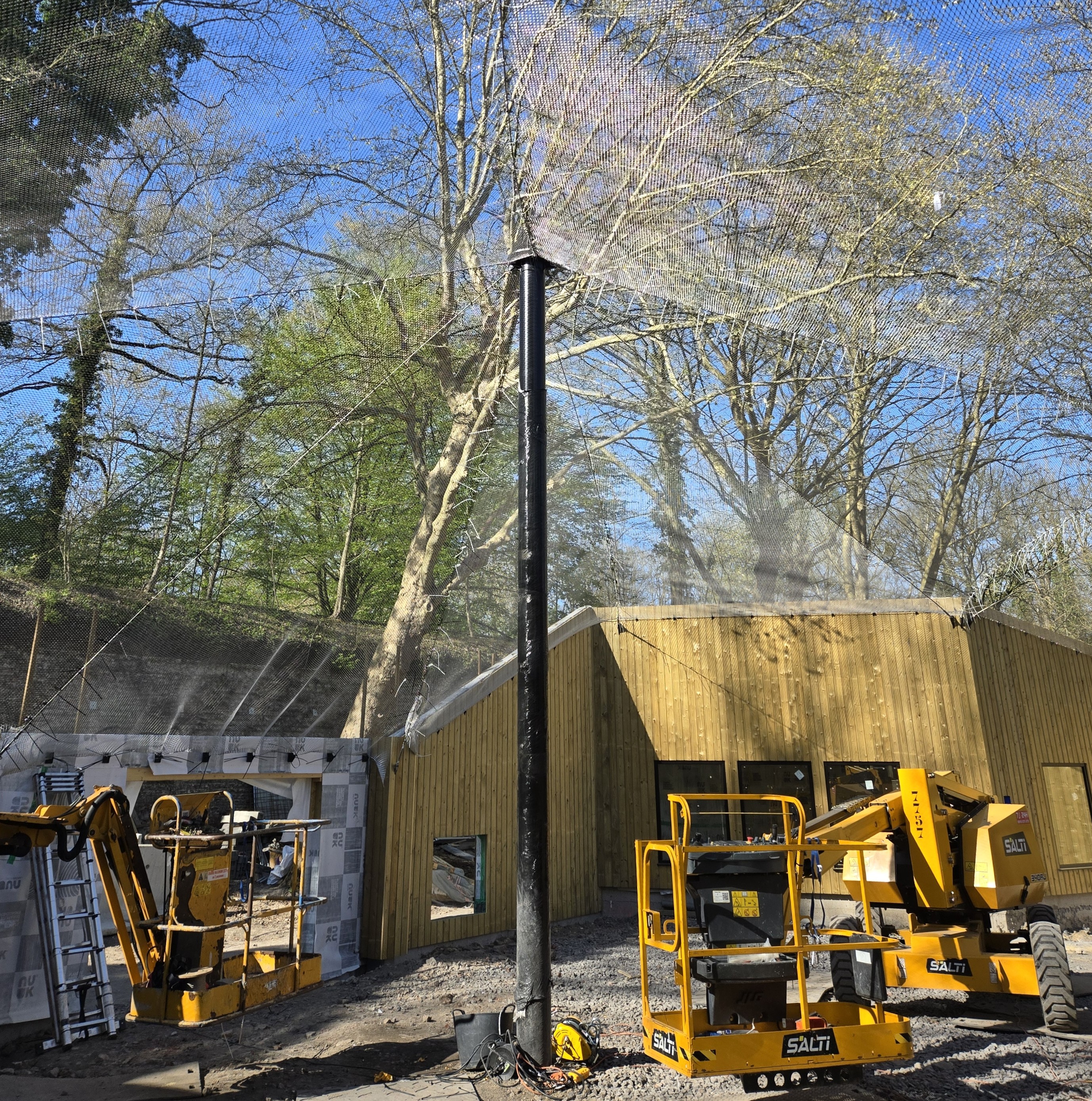 Sur une volière XXL, couvrir une grande surface en toiture sans point d'appui intermédiaire reviendrait à mettre en tension un filet sur une portée excessive ce qui provoquerait une flèche centrale importante, voire une mise en charge anormale des ancrages périphériques. La solution retenue par notre bureau d'études : un poteau central métallique, implanté au cœur de la volière, qui soulève le filet en son milieu et répartit les efforts de manière équilibrée sur l'ensemble de la structure.
